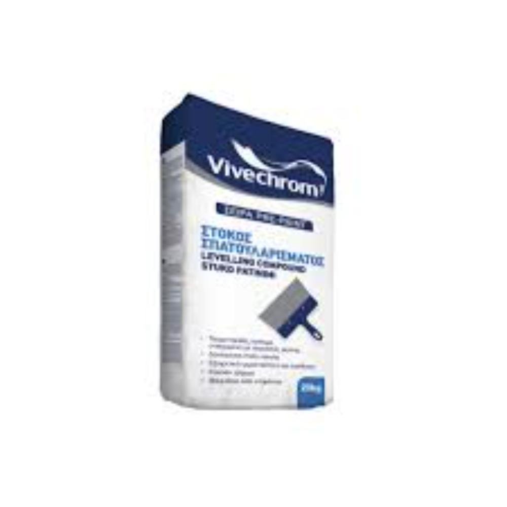 Ο Στόκος Σπατουλαρίσματος Vivecrom εξομαλύνει τοίχους και οροφές πριν το βάψιμο. Αναμειγνύεις τη σκόνη με νερό και δημιουργείς κρεμώδη πάστα με εύκολη εφαρμογή. Το υλικό στεγνώνει γρήγορα, τρίβεται άνετα και χαρίζει λεία λευκή επιφάνεια χωρίς ρωγμές.