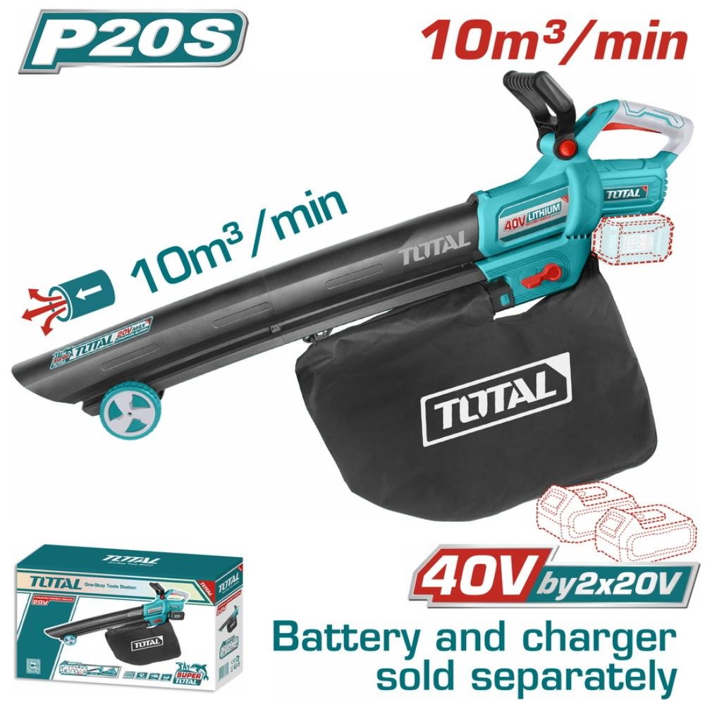 Δεν περιλαμβάνει μπαταρίες και φορτιστή, γεγονός που το καθιστά ιδανική επιλογή για όσους διαθέτουν ήδη εργαλεία της σειράς TOTAL 20V. Ο Φυσητήρας-Αναρροφητήρας Μπαταρίας  συνδυάζει πρακτικότητα, αυτονομία και ισχύ σε ένα μόνο εργαλείο, προσφέροντας λύσεις τόσο για ερασιτέχνες όσο και για επαγγελματίες. Με το πάτημα ενός κουμπιού, μετατρέπεται από φυσητήρα σε αναρροφητήρα, κάνοντάς τον απαραίτητο σύμμαχο στον τακτικό καθαρισμό εξωτερικών χώρων.